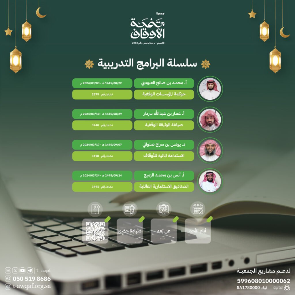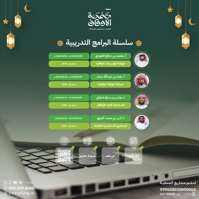جمعية تنمية الاوقافsamir00000001أكتوبر 16, 2025 جمعية اهلية , متخصصة في مجال تطوير وتنمية الاوقاف , مسجلة بوزراة الموارد البشرية والتنمية الاجتماعية